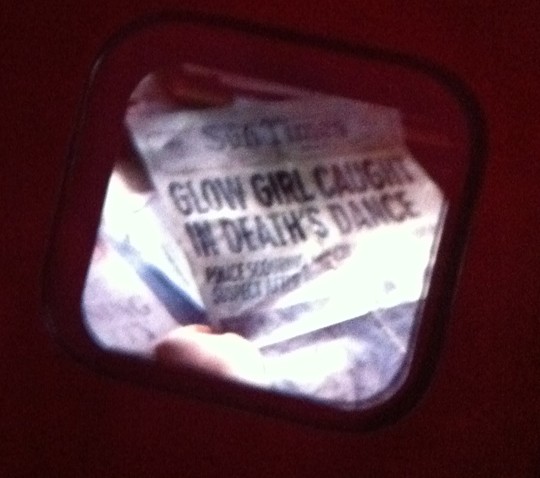 And another clue – a newspaper headline saying ‘Glowgirl caught in death’s dance’. We have no idea what these images amount to, do you?
