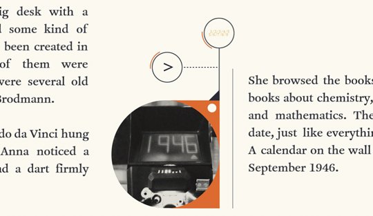 Device 6 brings a perfect blend of reading and interactivity. The heroine of the story, Anna, wakes up with a headache, and no memory, in a strange room. There’s a painting of an orange on the wall. She begins to explore and finds that she’s captive in a castle on an island. Through a window she can see a lighthouse, but she needs your help to escape. Maybe the artwork on the walls, and other items she finds while exploring the passages of the castle, hold clues – codes she can enter into the archaic electronic consoles she finds here and there.