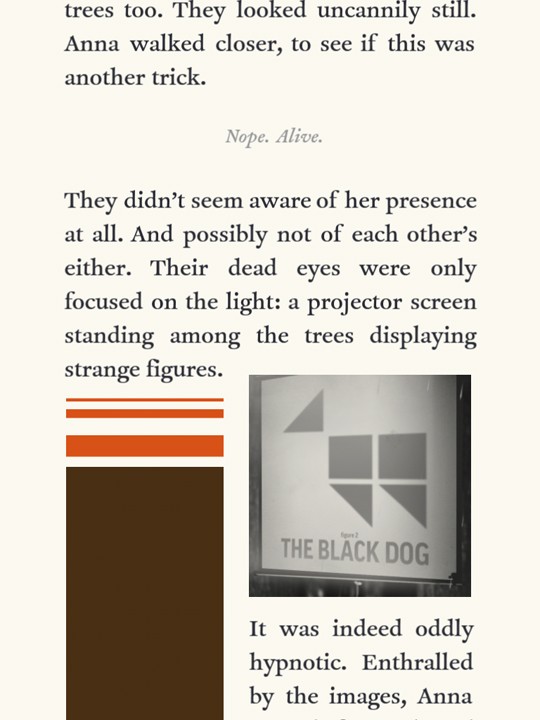 The layout of the text is cleverly used to enhance the interactivity. When she walks down a hallway, the words might well start scrolling way out off the screen as the doors and pictures she passes appear through holes in the virtual paper. You drag along with your finger to read on. When she reaches a corner, the text will turn a corner too and go off up or down. If the path forks, you can choose which sentence to read next – the one that carries on along the line, or the one that goes kicking off towards the rest rooms. You’ll twist and turn the iPad as you read and discover new puzzles.