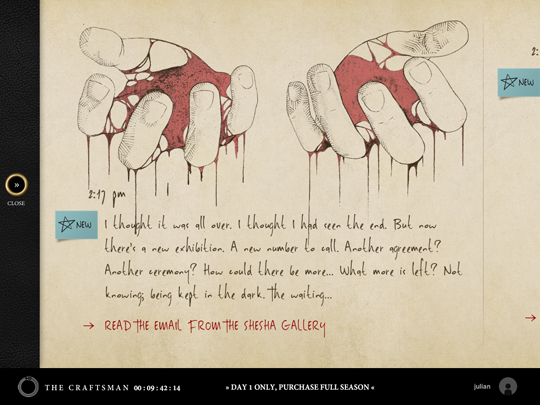 There’s more to it than watching a video. You engage with the game by exploring websites – it seems the Shesha Gallery in Knightsbridge has an exhibition for The Craftsman coming up and maybe this relates to Henry’s activities. You’ll get letters and emails from Sophie, and you’ll even make and receive phone calls. Judging by the trailer (below) some strange artefacts and gutchurning rituals may crop up too… It sounds very involving and there’s a disclaimer at the beginning warning that the app is not for those of a nervous disposition.