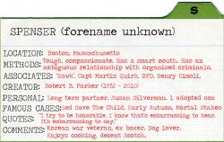 Spencer has a smart mouth. He sometimes manages to upset potential clients within five minutes of their first consultation, and is equally sassy with the criminal lowlifes he pursues. But he’s not all mouth. Spenser is rarely bettered in fair combat, and when things get deadly, he usually has serious back-up. He is fit, tough, realistic and compassionate. His relationship with the Boston police department is a mixture of mutual respect and suspicion. When it comes to the city’s gang bosses, he is not averse to scratching their backs if it suits his purpose, but he has a clearly defined line which he will never cross.