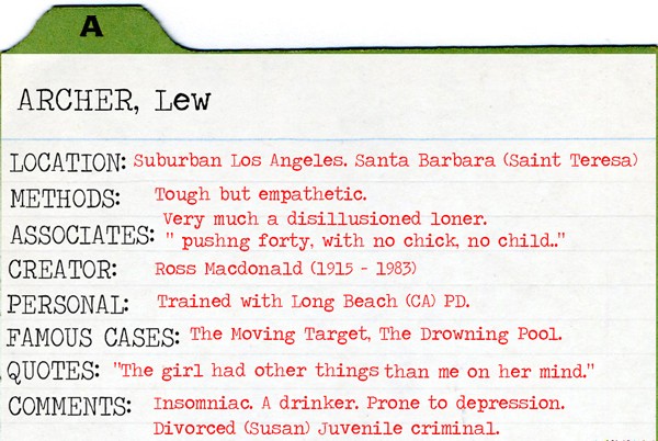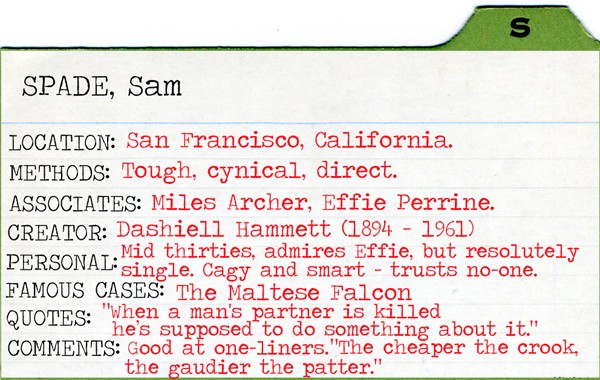 Also, I would move Hammett’s Sam Spade to the number one spot. He is the Ur PI; it is hard to imagine the others (with the exception of Sherlock Holmes, of course) existing without him. Also, we should have an honorable mention to Hammett’s Continental Op, the ultimate model of the man-hunter. Red Harvest is an essential read.