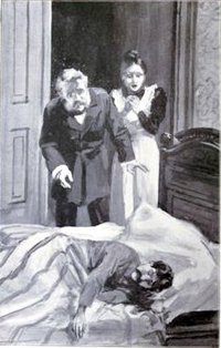 The formidable lady has overslept, but after lighting the downstairs fire, she remembers to wake one of the lodgers. Arthur Constant is an idealist, and a campaigner for workers’ rights. She bangs on his bedroom door, then makes the day’s first pot of tea. Taking a tray upstairs, she calls again. Still no response. She peeps through the keyhole, but the key is firmly in place. As she pounds on the door once again, she has a premonition that something is very, very wrong. So she summons her neighbour, the redoubtable retired detective Mr George Grodman. He batters down the door, which was locked and bolted from the inside, and is forced to cover Mrs Drabdump’s eyes from the horrors within…