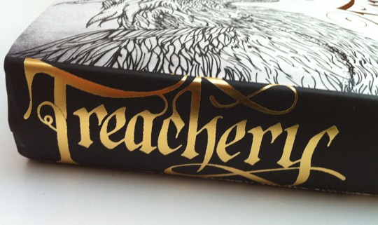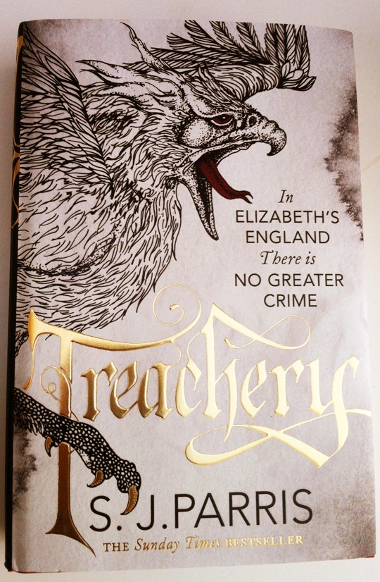 Have a look at this wonderful, gold embossed book jacket for Treachery by SJ Parris. This historical crime fiction novel is the fourth in a series by the author, set in Elizabethan times. The dust cover also features an illustration of a fierce-looking griffon, drawn by Daren Newman. There’s a gold emboss on the spine too, so it catches the light nicely from nearly any angle.