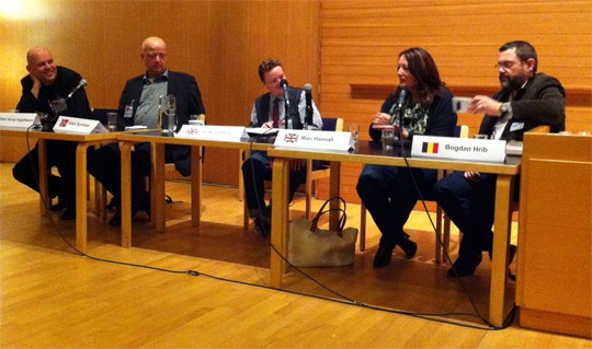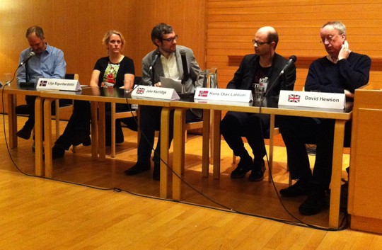 The action began with a panel on a the core topic of the conference – Nordic Perspectives. Moderated by Telegraph journalist Jake Kerridge, it brought together two Brits who have written books based in Nordic countries – David Hewson (the novel adaptations of The Killing, set in Denmark) and Michael Ridpath (The Fire and Ice series, set in Iceland) with Icelandic author Lilja Sigurdardottir and Norway’s Hans Olaf Lahlum (The Human Flies).