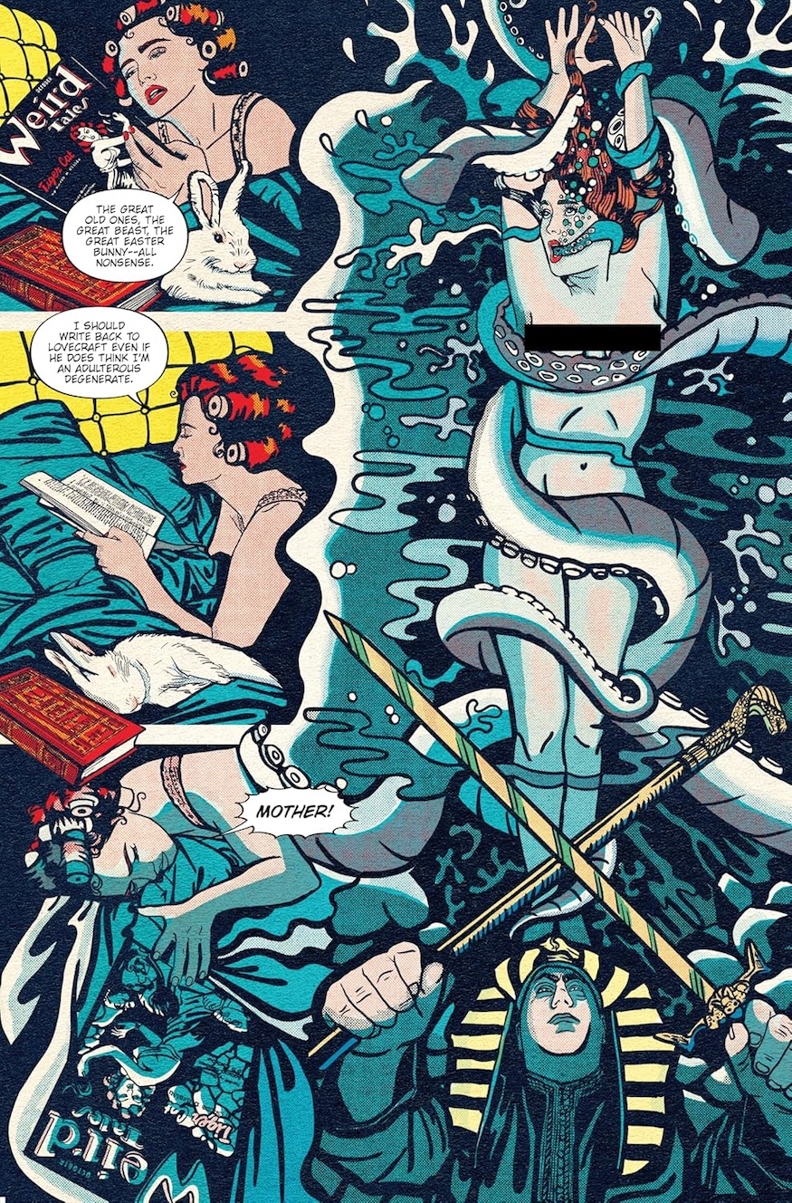 Via her surveillance of Harry Houdini, Minky has met HP Lovecraft. Lovecraft was helping the escapologist write a book debunking occult spiritualism. Since reading stories like The Call of Cthulhu written by Lovecraft, Minky has been plagued by nightmares and she has been exchanging letters with the author. Aleister Cowley lures Minky, her Welsh friend, Lovecraft and his wife to an island on the Hudson near Poughkeepsie. They’re drugged and we see the amazing spectacle of Crowley preparing to sacrifice them to some ancient horror of the type Lovecraft envisaged in his books.